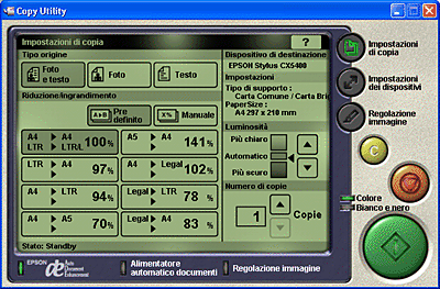 Usare questa applicazione per trasformare questo prodotto in una copiatrice digitale. L'applicazione simula sullo schermo una vera copiatrice, tuttavia le sue funzioni sono di gran lunga più potenti e flessibili di una copiatrice convenzionale. Quando si avvia questa applicazione, appare la seguente schermata.