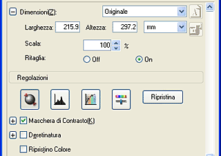 ![]() | Specificare le dimensioni in uscita dell'immagine acquisita in Dimensioni ed effettuare delle regolazioni con gli strumenti di regolazione della qualità dell'immagine, se necessario. |