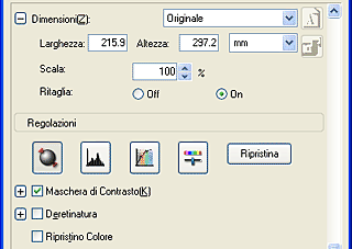Specificare le dimensioni in uscita dell'immagine acquisita in Dimensioni ed effettuare delle regolazioni con gli strumenti di regolazione della qualità dell'immagine, se necessario.