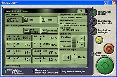 Usare questa applicazione per trasformare questo prodotto in una copiatrice digitale. L'applicazione simula sullo schermo una vera copiatrice, tuttavia le sue funzioni sono di gran lunga più potenti e flessibili di una copiatrice convenzionale. Quando si avvia questa applicazione, appare la seguente schermata.