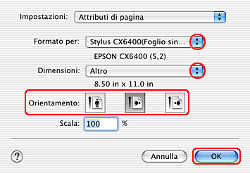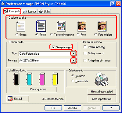 Selezionare Stylus CX6400 (Alimentatore - Margini zero) come impostazione di Formato per.