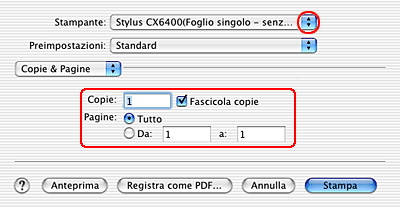 Selezionare Stylus CX6400 (Alimentatore - Margini zero) come impostazione di Stampante, quindi effettuare le impostazioni di Copie & Pagine.