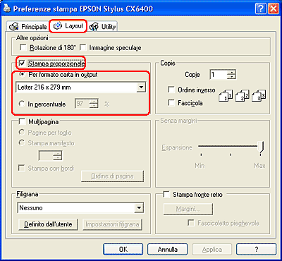 Fare clic sulla scheda Layout, quindi selezionare la casella di controllo Stampa proporzionale. Per modificare le dimensioni del documento, è possibile selezionare le impostazioni che seguono.