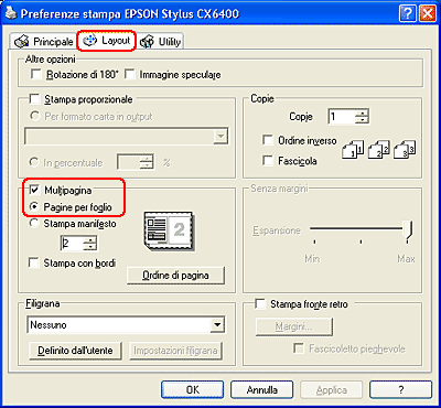 ![]() | Nella finestra di dialogo Layout, selezionare la casella di controllo denominata Multipagina, quindi selezionare Pagine per foglio. |