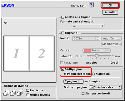 La stampa di pagine multiple su foglio singolo consente di stampare due o quattro pagine su fogli singoli.