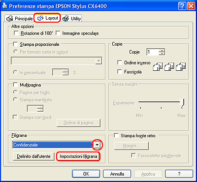 La stampa con filigrana permette di stampare sul documento una filigrana di tipo testo o immagine.
