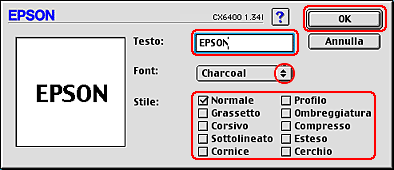 Accertarsi di aver selezionato la filigrana appropriata nella casella di riepilogo Filigrana, quindi definire le impostazioni relative a Colore, Posizione, Densità, Formato, Font, Stile font e Angolo. Per informazioni dettagliate, vedere la Guida in linea. Le impostazioni definite vengono mostrate nel riquadro a sinistra della finestra di dialogo.