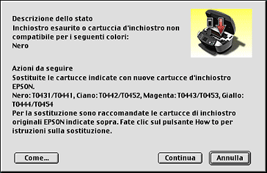 Quando l'inchiostro è scarso o esaurito, sotto la casella di testo apparirà il pulsante Come.... Fare clic su Come... ed EPSON Status Monitor 3 guiderà l'utente nella procedura di sostituzione della cartuccia.