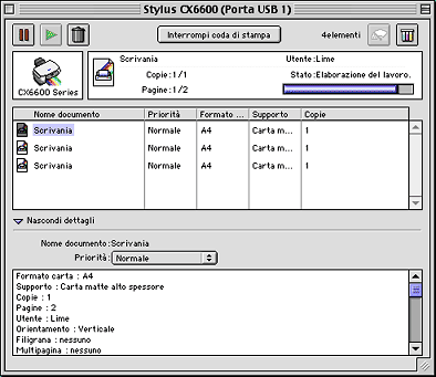Dopo aver inviato un lavoro di stampa alla stampante, è possibile utilizzare l'utility EPSON MonitorIV per controllare, annullare o modificare la priorità dei lavori di stampa che sono in coda e in attesa di essere stampati. Questa utility mostra inoltre lo stato del lavoro in corso di stampa.
