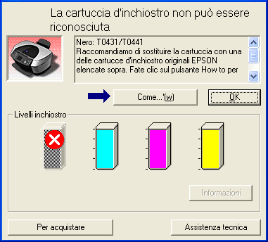 Quando l'inchiostro è scarso o esaurito, viene visualizzato il pulsante Come.... Fare clic su Come... ed EPSON StatusMonitor guiderà l'utente nella procedura di sostituzione della cartuccia d'inchiostro.