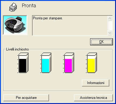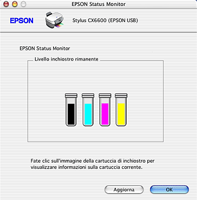 È possibile utilizzare questa utility per controllare i livelli di inchiostro prima della stampa. Quando è aperta, EPSON StatusMonitor visualizza la quantità di inchiostro rimanente al momento dell'apertura. Per aggiornare le informazioni sul livello di inchiostro, fare clic su Aggiorna.
