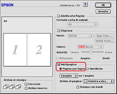La stampa di pagine multiple su foglio singolo consente di stampare due o quattro pagine su fogli singoli.