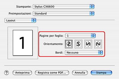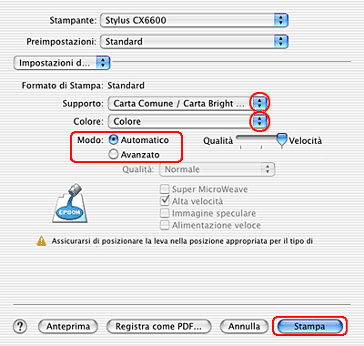 ![]() | Selezionare Stylus CX6600 come impostazione di Stampante. |