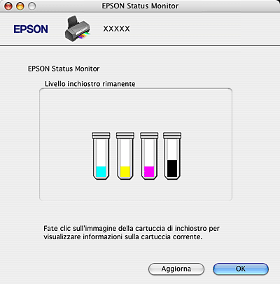 ![]() È inoltre possibile utilizzare questa utility per verificare lo stato della cartuccia prima della stampa. EPSON StatusMonitor visualizza lo stato della cartuccia d'inchiostro al momento dell’apertura. Per aggiornare lo stato della cartuccia d'inchiostro, fare clic su Aggiorna.