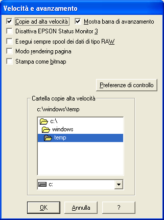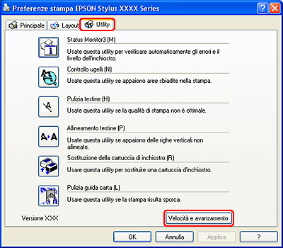 Selezionando determinate impostazioni nella finestra Velocità & avanzamento, è possibile aumentare la velocità di stampa. Fare clic sul pulsante Velocità e avanzamento nella finestra Utility del driver della stampante.