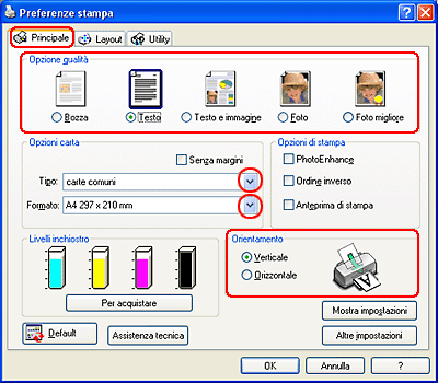 Selezionare Verticale (alto) o Orizzontale (largo) per modificare l’orientamento delle stampe.