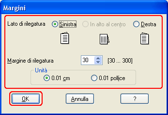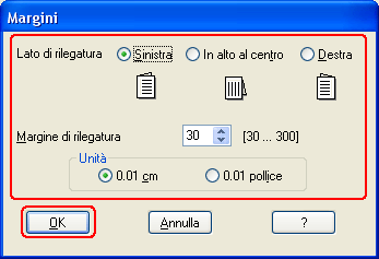Scegliere tra cm o pollice come impostazione di Unità. Quindi, specificare la larghezza del margine di rilegatura. È possibile immettere larghezze comprese tra 0,3 cm e 3 cm oppure tra 0,12 pollici e 1,18 pollici.