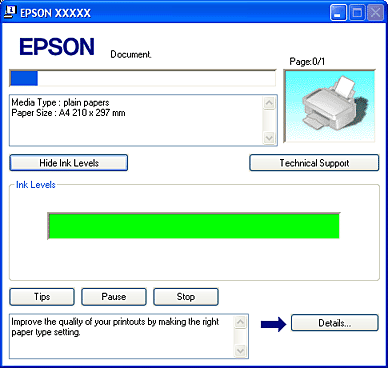 ![]() Lo stato dell'inchiostro verrà indicato da un grafico. ![]() La barra di avanzamento viene automaticamente visualizzata quando si avvia un lavoro di stampa. Da questa finestra è possibile controllare lo stato dell'inchiostro. Fare clic sul pulsante Check Ink Levels (Verifica livelli inchiostro) nella schermata della barra di avanzamento per visualizzare lo stato dell'inchiostro, come mostrato sotto.