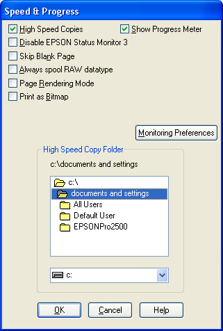 E'possibile aumentare la velocità di stampa selezionando alcune impostazioni nella finestra Speed & Progress (Velocità & avanzamento). Fare clic sul pulsante Speed & Progress (Velocità & avanzamento) nella finestra Maintenance del driver della stampante.