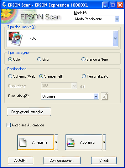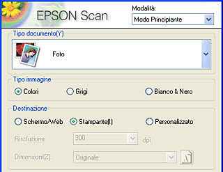 EPSON Scan fornisce tre modi per la definizione delle impostazioni di scansione: Principiante, Office e Professionale. In questa sezione viene descritto come eseguire la scansione di un'immagine nel modo Principiante. Nel modo Principiante le immagini vengono acquisite utilizzando le impostazioni di base. Per informazioni dettagliate, vedere Modifica del modo di scansione.