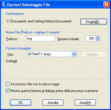 Per salvare le immagini acquisite senza modificarle con un'applicazione, avviare direttamente EPSON Scan. Dopo la scansione, le immagini acquisite vengono automaticamente salvate sotto forma di file nella cartella specificata nella finestra di dialogo Opzioni Salvataggio File. Questa operazione può essere impostata come segue: