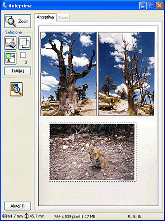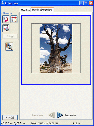 Il metodo di anteprima Normale consente di visualizzare l'intera immagine di anteprima e gli effetti delle impostazioni effettuate; consente inoltre di effettuare ulteriori regolazioni dell'immagine. È inoltre possibile utilizzare delle cornici intermittenti per la scansione di parti specifiche di un'immagine. Per informazioni dettagliate sulle cornici intermittenti, vedere Uso delle cornici intermittenti.