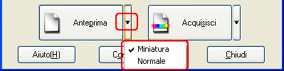 Facendo clic su Anteprima viene avviata la scansione preliminare e l'anteprima dell'immagine. A seconda della modalità impostata e delle impostazioni di Tipo documento, a destra del pulsante Anteprima viene visualizzata una piccola freccia che consente di selezionare un metodo di anteprima. Per cambiare il metodo di anteprima, fare clic sulla freccia e selezionare Miniatura o Normale.