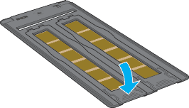 Far scorrere il bordo della striscia nel supporto per originali da 35 mm, con il lato principale (lato in cui l'immagine appare normalmente) rivolto verso l'alto. Posizionare la striscia in modo che tutto il fotogramma sia situato all'interno del supporto.