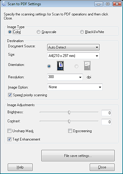 Per le altre impostazioni della finestra EPSON PDF Plug-in Settings (Opzioni EPSON PDF Plug-in), vedere l'Aiuto EPSON Scan.
