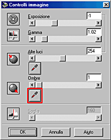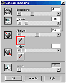 Nella finestra di dialogo Controlli immagine, fare clic sul pulsante a forma di contagocce sotto il dispositivo di scorrimento Alte luci.