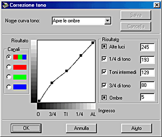 La funzione Correzione tono dispone di curve di tono predefinite che consentono di regolare il contrasto in un'immagine. Ciò fornisce un maggiore controllo sull'immagine se usato insieme alle impostazioni della finestra di dialogo Controlli immagine.