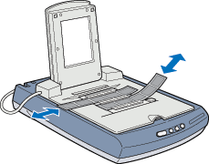 Per rimuovere un supporto per pellicola dal piano di lettura documento, farlo scorrere verso sinistra o verso destra e quindi toglierlo dalla finestra.