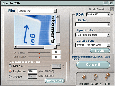 Usare questa applicazione per effettuare una scansione e convertire un'immagine in un formato file compatibile con un PDA. Quando si avvia questa applicazione, l'immagine viene acquisita da EPSON TWAIN e visualizzata nella finestra di dialogo Verify Assistant. Fare clic su Fine; apparirà la seguente finestra di dialogo. Fare clic su Converti per esportare l'immagine nella cartella Sync o nella cartella specificata. Per maggiori informazioni, consultare la documentazione di EPSON Smart Panel.