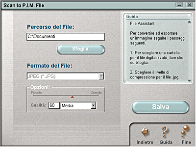 Usare questa applicazione per acquisire, convertire e quindi salvare un'immagine in una cartella specifica. Quando si utilizza questa funzione, l'immagine viene acquisita da EPSON TWAIN e visualizzata nella finestra di dialogo Verify Assistant. Fare clic su Fine; apparirà la seguente finestra di dialogo. Per maggiori informazioni, consultare la documentazione di EPSON Smart Panel.