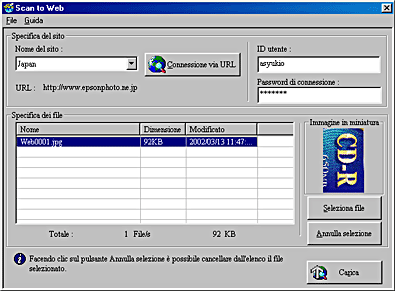Usare questa applicazione per effettuare la scansione di un'immagine utilizzando la tecnologia PRINT Image Matching, e trasferirla quindi sul sito Web EPSON per la condivisione di foto. Quando si avvia questa applicazione, l'immagine viene acquisita da EPSON TWAIN e visualizzata nella finestra di dialogo Verify Assistant. Fare clic su Fine; apparirà la seguente finestra di dialogo. Fare clic su Carica per trasferire l'immagine sul sito. Per maggiori informazioni, consultare la documentazione di EPSON Smart Panel. Notare che le informazioni di PRINT Image Matching vengono incluse in tutti i file di immagini acquisiti.