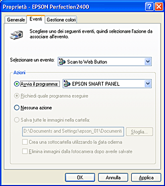 Se è necessario disabilitare gli Eventi scanner, selezionare Nessuna azione nella finestra di dialogo Proprietà dello scanner.