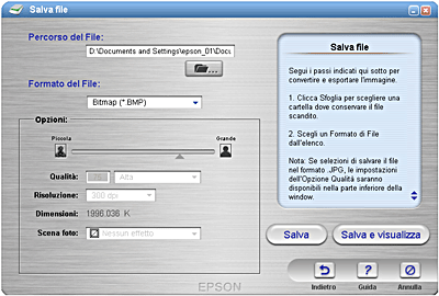 Usare questa applicazione per effettuare una scansione e convertire un'immagine utilizzando lo standard PRINT Image Matching, e quindi salvare l'immagine acquisita in una cartella specifica. È possibile inoltre aggiungere vari effetti di colore all'immagine acquisita. Quando si avvia questa applicazione, l'immagine viene acquisita da EPSON Scan e visualizzata nella finestra di dialogo Verify Assistant. Fare clic su Avanti per visualizzare la finestra di dialogo che segue.