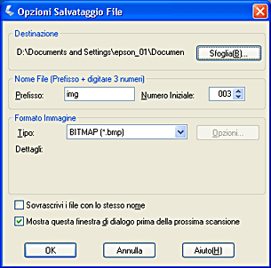 Se si desidera modificare il nome del file, digitare una stringa di caratteri alfanumerici nel Prefisso e selezionare il numero iniziale. Il nome del file viene generato con una combinazione di prefissi e numeri specificati qui.