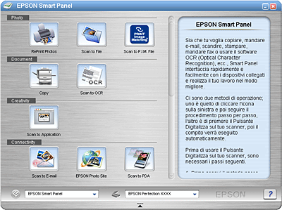 EPSON Smart Panel consente di acquisire ed inviare dati direttamente ad un'applicazione designata, sul sito Web EPSON per la condivisione di foto o sul proprio PDA (Personal Digital Assistant). È possibile inoltre digitalizzare foto e documenti in modo facile e veloce.