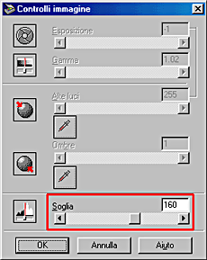 ![]() | Utilizzare il dispositivo di scorrimento Soglia per modificare il valore della soglia, verificando i risultati delle modifiche nella finestra di Anteprima. La regolazione del valore della soglia rende più agevole il riconoscimento OCR dei caratteri. |