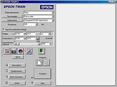 È possibile utilizzare la finestra di Anteprima per vedere gli effetti della maggior parte delle impostazioni di EPSON TWAIN e per effettuare ulteriori regolazioni sull'immagine. È inoltre possibile utilizzare una cornice intermittente (riquadro) per eseguire la scansione di parti selezionate di un'immagine.
