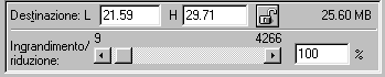Le dimensioni correnti di larghezza/altezza di un'immagine possono essere bloccate, consentendo in tal modo al rapporto larghezza/altezza dell'immagine di origine di variare in base al valore di scala, oppure al valore di scala di variare in base al rapporto larghezza/altezza dell'immagine di origine. Ciò risulta utile in modo speciale quando le dimensioni di un'immagine non rientrano nel formato della carta sulla quale si desidera stampare ma si intende mantenere le proporzioni originali dell'immagine. Immettere il formato della carta nei campi L e H del campo Destinazione e quindi fare clic sul pulsante Blocco. Il valore di scala viene automaticamente cambiato, mantenendo il rapporto corrente di larghezza/altezza per l'adattamento alla carta.