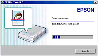 EPSON TWAIN imposta automaticamente la Impostazione Posizione immagine e l'Impostazione Esposizione, quindi avvia la scansione. Se si acquisiscono più fotografie, verrà indicato il numero delle immagini acquisite.