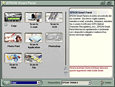 Selezionare un'applicazione dalla casella di riepilogo EPSON Smart Panel oppure premere il tasto Start nell'angolo inferiore sinistro.
