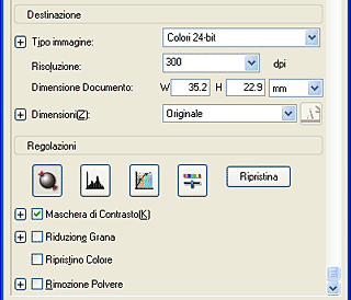 ![]() | Utilizzare Dimensioni per specificare le dimensioni finali dell'immagine acquisita. Se necessario, specificare anche le impostazioni di regolazione. Per informazioni dettagliate, vedere Creazione di riproduzioni di notevole effetto. |