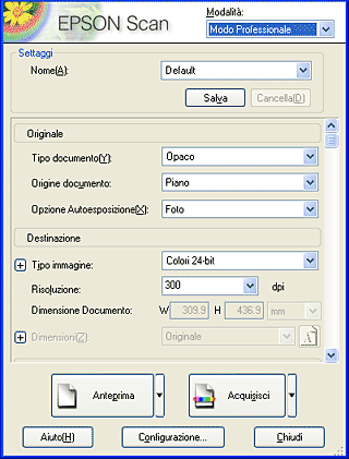 ![]() | Avviare EPSON Scan e quindi selezionare il modo Professionale. Per informazioni dettagliate sulla selezione di un modo di scansione, vedere Modifica del modo di scansione. |