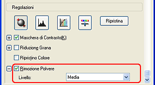 Selezionare la casella di controllo Rimozione polvere. (È possibile che risulti necessario scorrere fino al fondo della schermata.) Nel modo Principiante, aprire innanzitutto la finestra di dialogo Regolazione immagine per accedere alla casella di controllo Rimozione polvere.