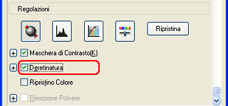 Selezionare la casella di controllo Deretinatura nella sezione Regolazioni (può risultare necessario scorrere fino al fondo della schermata). Nel modo Principiante, aprire innanzitutto la finestra di dialogo Regolazione immagine per accedere alla casella di controllo Deretinatura.