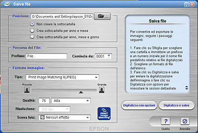 Specificare le impostazioni del percorso, del nome del file e del formato dell'immagine. Per il tipo di formato dell'immagine, selezionare Print Image Matching II (JPEG) o Print Image Matching II (TIFF) dalla casella di riepilogo Tipo.