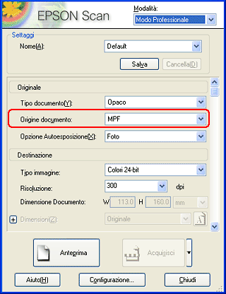 ![]() | Nella finestra principale di EPSON Scan, assicurarsi di selezionare MPF dall'elenco Origine documento, quindi scegliere le impostazioni appropriate per la scansione. |
